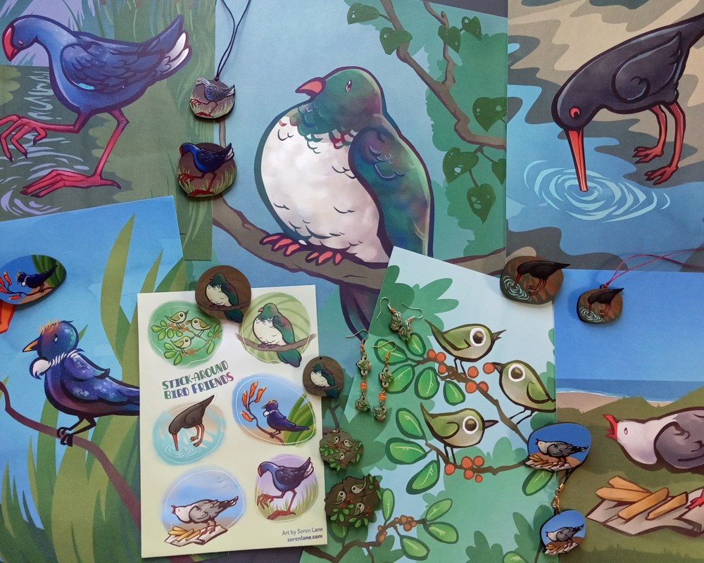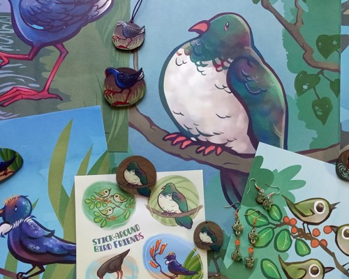Birds are a great subject to work on; they have a combination of innate beauty and a certain goofiness that I find very relatable. The key is to strike a balance between these characteristics. The kererū design, for example, required half-a-dozen redraws at the sketch stage before I was satisfied with the exact, ideal level of roundness.